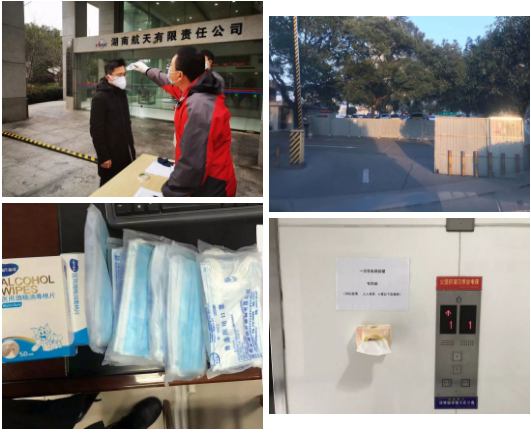 湖南航天采取了發(fā)放防控疫情物資給職工、在科研樓大門口設置兩個體溫檢測處,對進出大門口的人員進行體溫檢測、檢查各單位復工方案、黨委領導帶隊“四不兩直”對各單位落實的復工方案情況進行檢查、采取交替上班、云端在線上班等多種靈活上班方式、組織開展復工上班方式申報、落實各單位人員基本情況、全員簽訂《疫情防控承諾書》、組織各單位簽訂《疫情防控責任書》、在科研樓大廳LED屏、廣告機、電梯間等宣傳陣地播報疫情防控內容、為減少感染,6層以下電梯暫停使用,鼓勵員工爬樓梯、設置廢棄一次性口罩專用垃圾桶、為職工提前預定餐飲,并打包分裝派送到人,分時分餐,避免食堂聚餐、廠區(qū)實行全廠封閉管理。