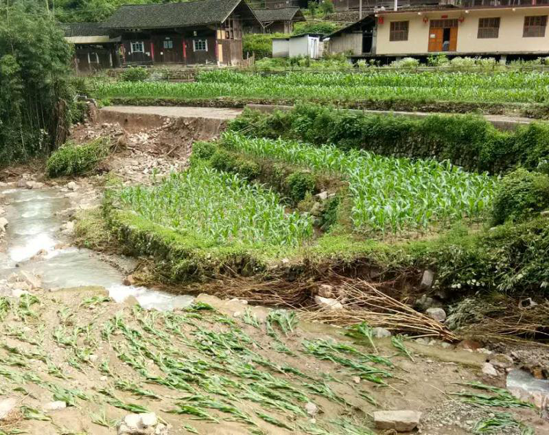 2020年06月10日凌晨2點至6點,老天爺像一頭發(fā)怒的獅子侵襲了我們的村莊,整個松溪村頓時被這傾盆而下的暴雨籠罩,這是我見過村里下的一場最大的暴雨,村里的道路、耕地、農(nóng)作物、房屋都造成了不同程度損失,我們辛苦辛苦養(yǎng)殖的稻花魚被淹,剛插上的禾苗、玉米被沖走,道路塌方導(dǎo)致交通中斷,剛被修好的堤壩又受洪水的沖擊而產(chǎn)生裂縫,沖垮多處.一早發(fā)現(xiàn),泥沙、碎石已經(jīng)使整個村莊都凌亂不堪,所有的村民和我一樣,覺得上半年的辛苦勞作都功虧一簣。村民彭萬綠詳細(xì)描繪著那晚暴雨時的情景。