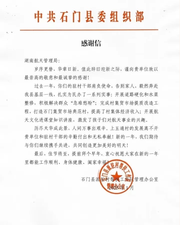 為感謝湖南航天一直以來對鄉(xiāng)村振興工作做出的積極努力。石門縣派駐村幫扶工作隊管理辦公室近日特意發(fā)來了《感謝信》。