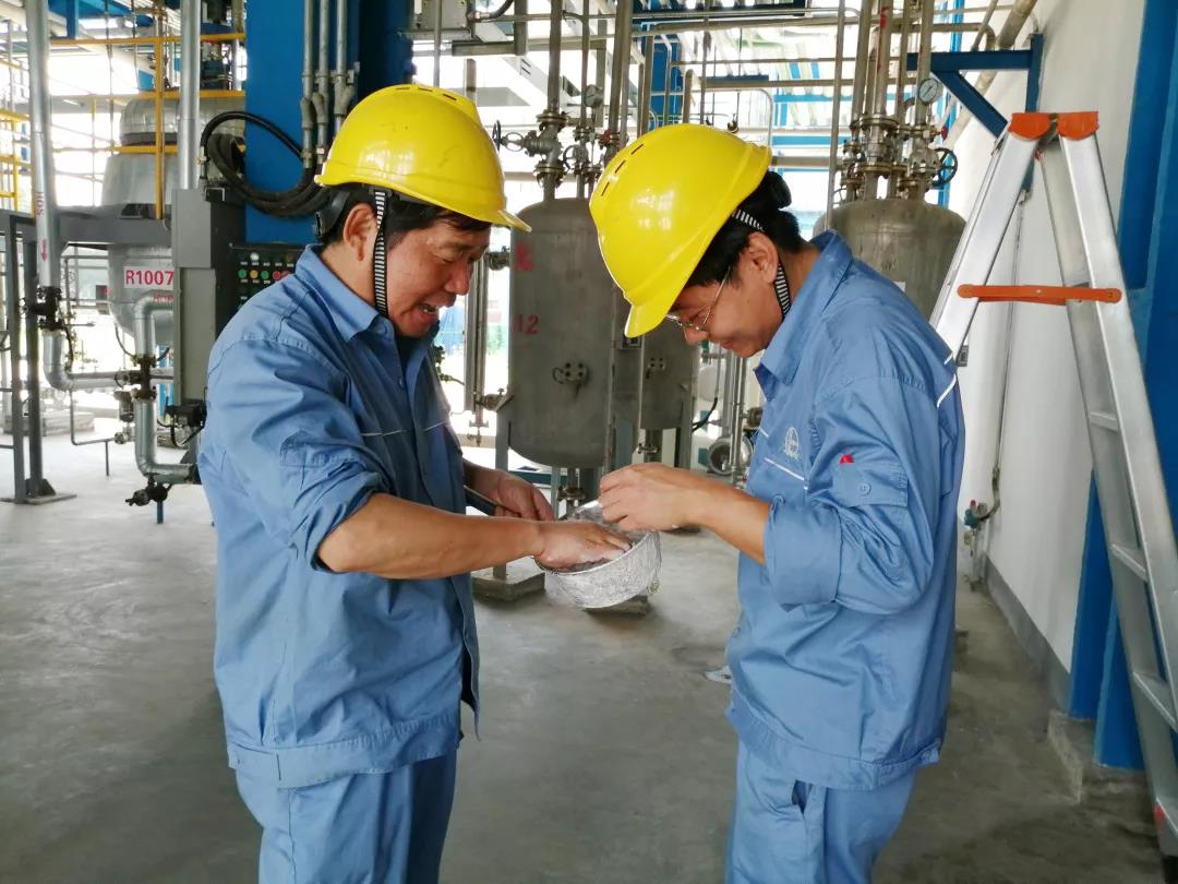 進(jìn)入中試線設(shè)備調(diào)試階段后,新材料院特種高分子材料事業(yè)部全體成員脫下實(shí)驗(yàn)服,換上安全帽和工裝常駐岳陽,開啟“5+2”“白+黑”工作模式,為聚酰亞胺產(chǎn)品試生產(chǎn)奮戰(zhàn)。近日,聚酰亞胺中試線終于完成了第一釜中間體生產(chǎn)!當(dāng)看到中間體從反應(yīng)釜中出來時(shí),現(xiàn)場工作人員都激動(dòng)不已,滿是汗水的臉上洋溢起燦爛的笑容。