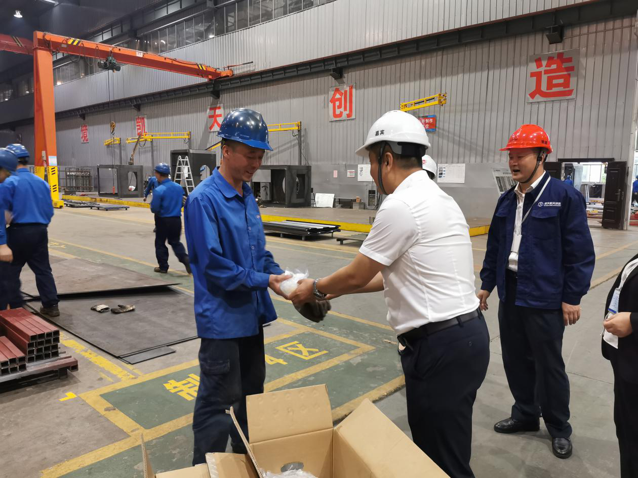 宋衛(wèi)武代表湖南航天黨委、航天凱天經(jīng)營班子,勉勵(lì)大家說,“在炎熱的酷暑中,大家加班加點(diǎn)完成任務(wù)訂單,趕超序時(shí)進(jìn)度,大家辛苦了,謝謝你們?yōu)楣窘?jīng)營任務(wù)完成付出的辛勤勞動。國慶與中秋雙節(jié)即將來臨,今天到年底正好還有100天,我們離經(jīng)營目標(biāo)和序時(shí)進(jìn)度還有較大的差距,公司已經(jīng)吹響了“沖刺一百天 打贏攻堅(jiān)戰(zhàn)”的號角,還需要大家繼續(xù)加班加點(diǎn)趕超任務(wù),特代表公司黨總支、經(jīng)營班子向大家致以節(jié)日的問候。希望大家越是生產(chǎn)繁忙,越要注意安全質(zhì)量,注意身體健康,做到兩不誤兩促進(jìn)”。慰問中,宋衛(wèi)武還向高級副總裁王宏詳細(xì)詢問了目前智能智慧成套裝備公司的生產(chǎn)產(chǎn)能、進(jìn)度及遇到的問題,提出了指導(dǎo)性意見。