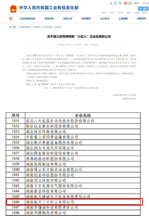 近日,經(jīng)過層層嚴(yán)格選拔,湖南航天三豐科工有限公司最終通過審核,入選工信部第三批專精特新“小巨人”企業(yè)。