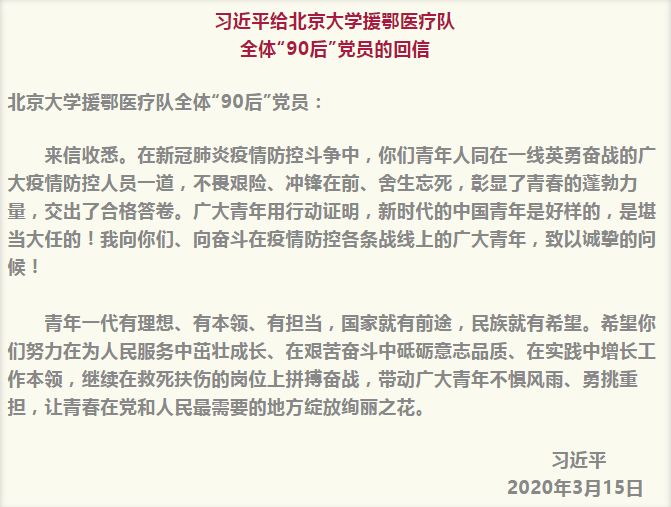中共中央總書記、國家主席、中央軍委主席習近平3月15日給北京大學援鄂醫(yī)療隊全體“90后”黨員回信,向他們和奮斗在疫情防控各條戰(zhàn)線上的廣大青年致以誠摯的問候。