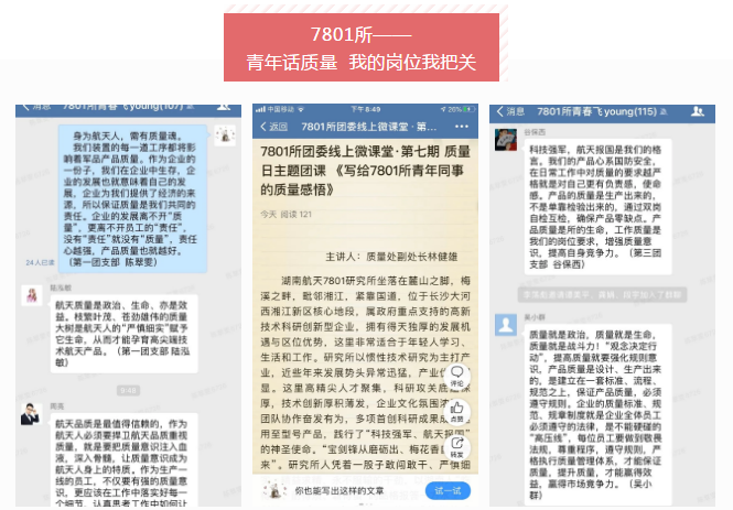 當(dāng)質(zhì)量與崗位、青春邂逅,會(huì)碰撞出怎樣的火花?3月22日,在2019年“航天質(zhì)量日”來(lái)臨之際,7801所團(tuán)委利用航天云信開(kāi)展線上主題活動(dòng)“青年永擔(dān)當(dāng),質(zhì)量大家談”。以航天質(zhì)量日為契機(jī),開(kāi)展線上學(xué)習(xí)交流,凝聚青年智慧,為提升航天產(chǎn)品質(zhì)量獻(xiàn)計(jì)、獻(xiàn)策!