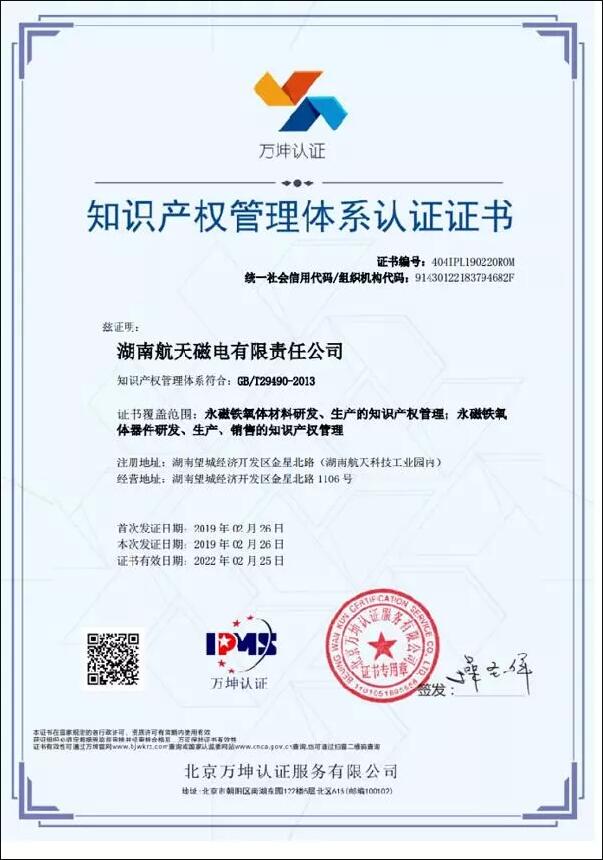 近日,湖南磁電正式獲得由北京萬坤認證服務(wù)有限公司頒發(fā)的《知識產(chǎn)權(quán)管理體系認證證書》(證書編號:404IPL190220R0M)。根據(jù)《湖南航天2018年知識產(chǎn)權(quán)工作要點》工作安排,湖南磁電是繼新材料院、三豐公司之后,湖南航天第三家獲得知識產(chǎn)權(quán)管理體系認證的企業(yè)。知識產(chǎn)權(quán)管理體系貫標旨在幫助企業(yè)建立科學、標準化的知識產(chǎn)權(quán)管理制度,形成貫穿生產(chǎn)經(jīng)營各個環(huán)節(jié)的知識產(chǎn)權(quán)管理體系,實現(xiàn)對知識產(chǎn)權(quán)的獲取、維護、運用和保護,提升企業(yè)的國內(nèi)、國際競爭力,保障企業(yè)的可持續(xù)發(fā)展。