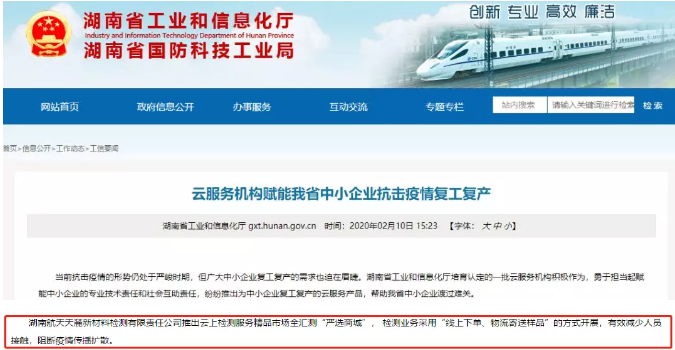 湖南航天天麓公司全匯測“嚴(yán)選商城”成功入選湖南省工業(yè)和信息化廳培育認(rèn)定的云服務(wù)機構(gòu),助力中小企業(yè)復(fù)工復(fù)產(chǎn),為檢測產(chǎn)業(yè)持續(xù)發(fā)展保駕護航。
