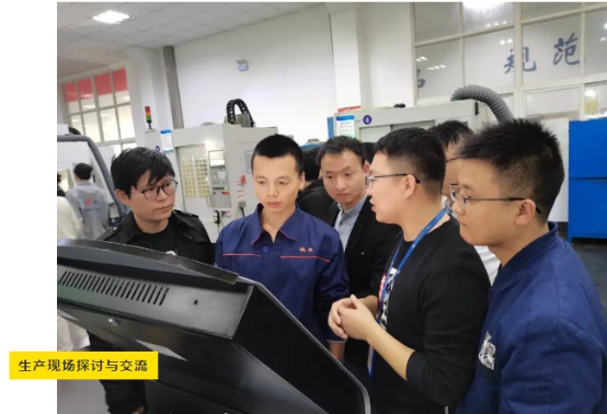 緊接著來到生產(chǎn)現(xiàn)場,看到先進(jìn)的機(jī)床以及無紙化作業(yè)的MES系統(tǒng)在生產(chǎn)中的運(yùn)用,青年們特別激動,同時與誠遠(yuǎn)公司技師周頌進(jìn)行了深入的探討和交流。