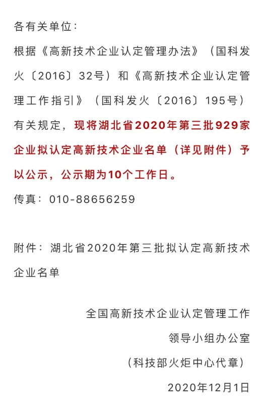 近日,由全國(guó)高新技術(shù)企業(yè)認(rèn)定管理工作領(lǐng)導(dǎo)小組辦公室根據(jù)《高新技術(shù)企業(yè)認(rèn)定管理辦法》(國(guó)科發(fā)火[2016]32號(hào))和《高新技術(shù)企業(yè)認(rèn)定管理工作指引》(國(guó)科發(fā)火[2016]195號(hào))的有關(guān)規(guī)定,對(duì)湖北省2020年共三批家企業(yè)擬認(rèn)定高新技術(shù)企業(yè)名單進(jìn)行了公示,航天科工武漢磁電有限責(zé)任公司喜獲第三批擬認(rèn)定高新技術(shù)企業(yè)名單。