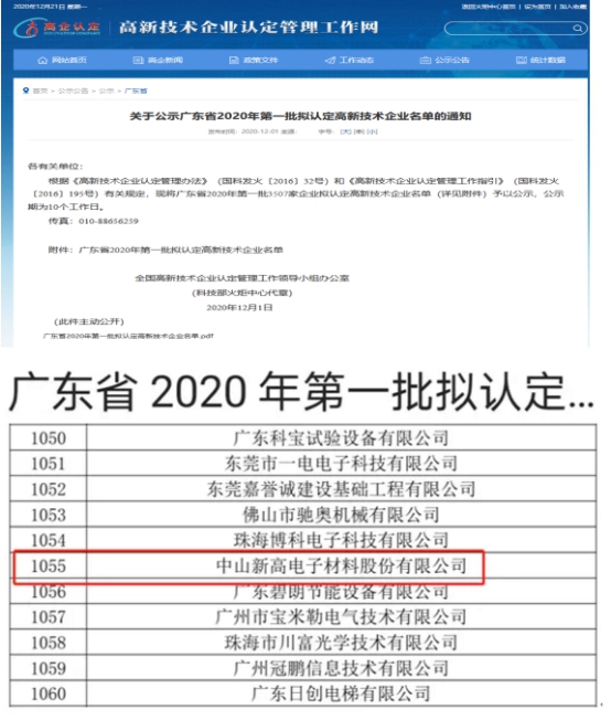 根據(jù)《高新技術(shù)企業(yè)認(rèn)定管理辦法》(國(guó)科發(fā)火〔2016〕32號(hào))和《高新技術(shù)企業(yè)認(rèn)定管理工作指引》(國(guó)科發(fā)火〔2016〕195號(hào))有關(guān)規(guī)定,對(duì)廣東省2020年共三批企業(yè)擬認(rèn)定高新企業(yè)技術(shù)企業(yè)名單進(jìn)行了公示,中山新高電子材料股份有限公司喜獲廣東省2020年第一批認(rèn)定高新技術(shù)企業(yè)名單。這是繼2017年后,中山新高再次獲評(píng)國(guó)家高新技術(shù)企業(yè)。
