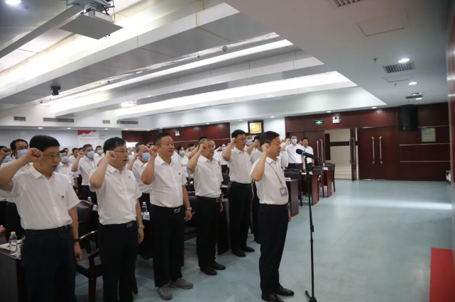 面向鮮紅的中國(guó)共產(chǎn)黨黨旗,在湖南航天黨委副書記、總經(jīng)理焦繼革的領(lǐng)誓下,新黨員代表進(jìn)行入黨宣誓,其他與會(huì)黨員重溫入黨誓詞。