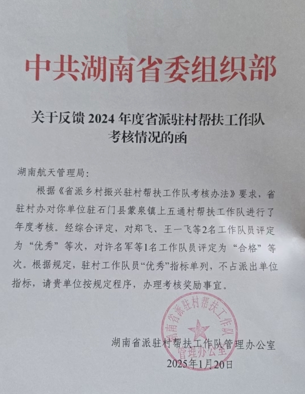 近日,湖南省委組織部公布了2024年度省派駐村幫扶工作隊的考核結(jié)果,其中湖南航天駐石門縣蒙泉鎮(zhèn)上五通村幫扶工作隊員獲得了“優(yōu)秀”等次。