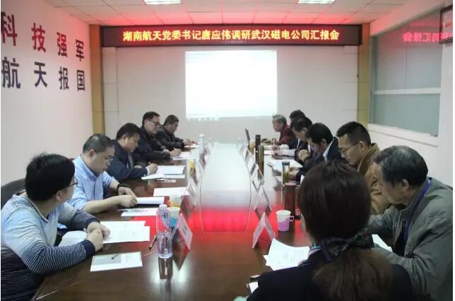 4月6日,湖南航天黨委書記、副董事長、副總經(jīng)理唐應(yīng)偉,資深專務(wù)、武漢磁電公司董事長鮑定超,總經(jīng)理助理、科研生產(chǎn)部部長王永森,民用產(chǎn)業(yè)部副部長張志錄,科研生產(chǎn)部技術(shù)發(fā)展組組長陳瑤一行到武漢磁電公司調(diào)研。武漢磁電公司黨委書記、副總經(jīng)理馬克勤,副總經(jīng)理劉佑平,副總經(jīng)理、紀(jì)委書記蔡亞夫,副總經(jīng)理葉仁杰,科技委主任章超美,二級(jí)專務(wù)、工會(huì)主席徐維鵬陪同調(diào)研,作情況介紹。