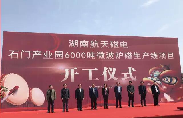 4月13日上午,湖南航天磁電石門(mén)三江磁材產(chǎn)業(yè)園微波爐磁生產(chǎn)線項(xiàng)目開(kāi)工儀式在石門(mén)經(jīng)濟(jì)開(kāi)發(fā)區(qū)兆恒工業(yè)園舉行。 石門(mén)縣委書(shū)記譚本仲、縣人大常委會(huì)主任李金生、縣政協(xié)主席陳云謀、縣政府常務(wù)副縣長(zhǎng)周功表、副縣長(zhǎng)韓翼飛、湖南航天有限責(zé)任公司董事長(zhǎng)、總經(jīng)理胡雪梅、副總經(jīng)理羅傳勇及湖南航天相關(guān)部門(mén)負(fù)責(zé)人,湖南航天磁電有限責(zé)任公司總經(jīng)理鄭自儒、副總經(jīng)理?xiàng)钗慕?、運(yùn)營(yíng)總監(jiān)廖孟安及項(xiàng)目相關(guān)負(fù)責(zé)人,共計(jì)約200多人出席開(kāi)工儀式,共同見(jiàn)證了這激動(dòng)人心的時(shí)刻。