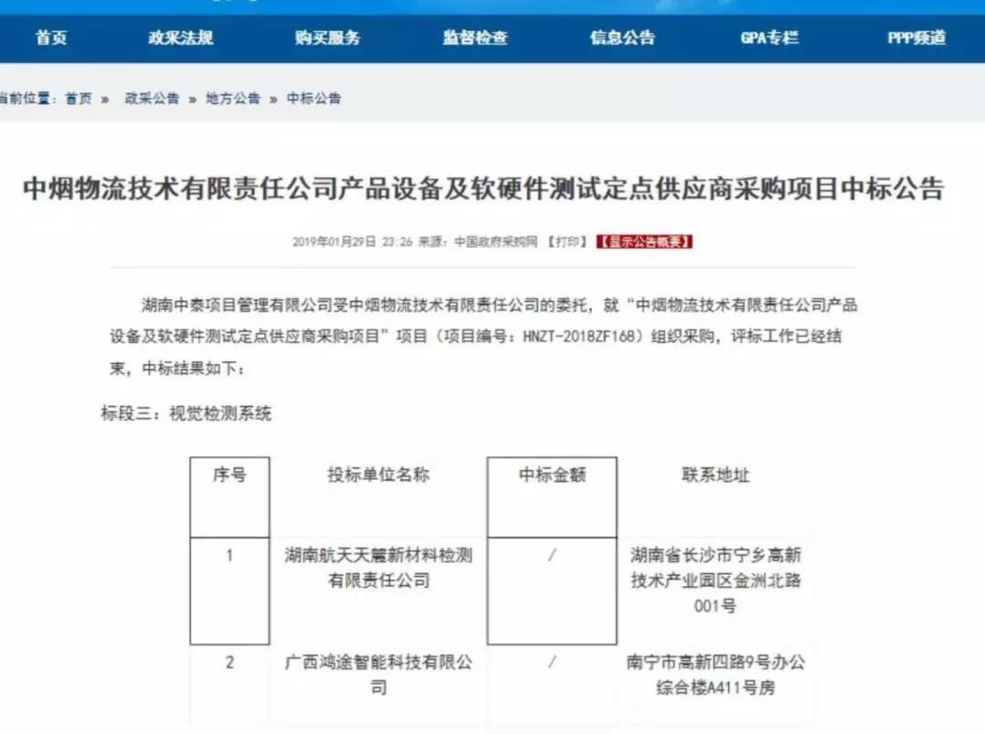 近日,中國(guó)政府采購(gòu)網(wǎng)上發(fā)布中煙物流技術(shù)有限責(zé)任公司產(chǎn)品設(shè)備及軟硬件測(cè)試定點(diǎn)供應(yīng)商采購(gòu)項(xiàng)目中標(biāo)公告,天麓公司以第一名成功中標(biāo)標(biāo)段三,在兩年服務(wù)期內(nèi)為中煙物流公司煙草物流項(xiàng)目提供視覺(jué)檢測(cè)系統(tǒng)。
