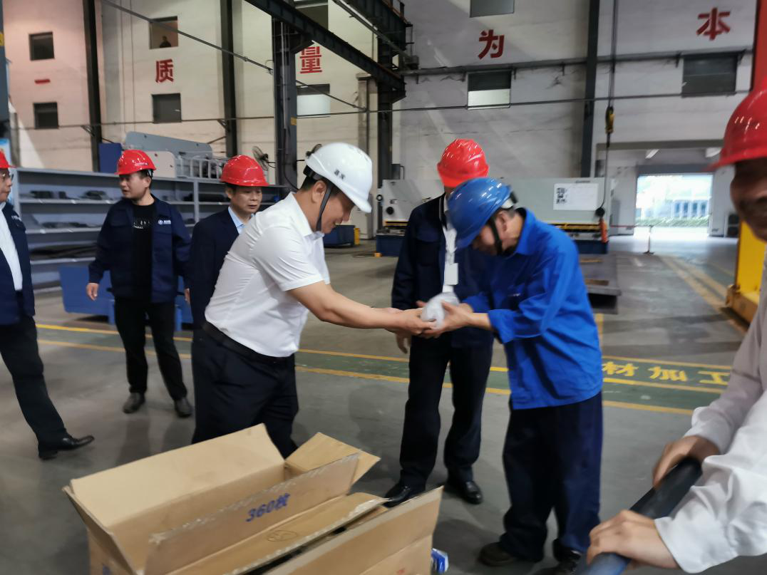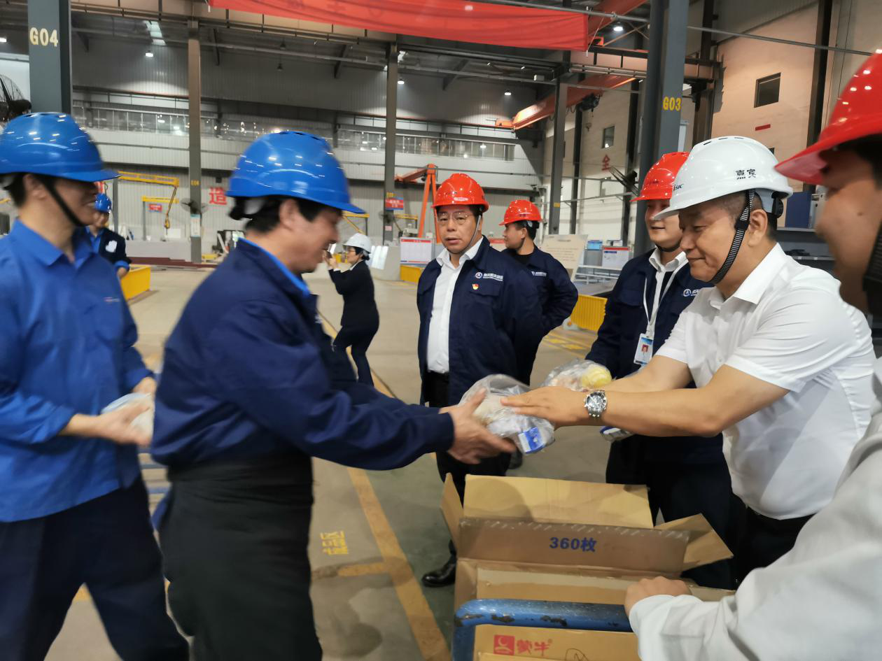 宋衛(wèi)武代表湖南航天黨委、航天凱天經(jīng)營班子,勉勵(lì)大家說,“在炎熱的酷暑中,大家加班加點(diǎn)完成任務(wù)訂單,趕超序時(shí)進(jìn)度,大家辛苦了,謝謝你們?yōu)楣窘?jīng)營任務(wù)完成付出的辛勤勞動。國慶與中秋雙節(jié)即將來臨,今天到年底正好還有100天,我們離經(jīng)營目標(biāo)和序時(shí)進(jìn)度還有較大的差距,公司已經(jīng)吹響了“沖刺一百天 打贏攻堅(jiān)戰(zhàn)”的號角,還需要大家繼續(xù)加班加點(diǎn)趕超任務(wù),特代表公司黨總支、經(jīng)營班子向大家致以節(jié)日的問候。希望大家越是生產(chǎn)繁忙,越要注意安全質(zhì)量,注意身體健康,做到兩不誤兩促進(jìn)”。慰問中,宋衛(wèi)武還向高級副總裁王宏詳細(xì)詢問了目前智能智慧成套裝備公司的生產(chǎn)產(chǎn)能、進(jìn)度及遇到的問題,提出了指導(dǎo)性意見。
