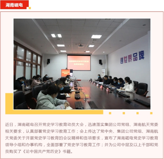 近日,湖南磁電召開黨史學(xué)習(xí)教育動員大會,迅速落實集團(tuán)公司黨組、湖南航天黨委相關(guān)要求,認(rèn)真部署黨史學(xué)習(xí)教育工作;會上傳達(dá)了黨中央、集團(tuán)公司黨組、湖南航天黨委關(guān)于開展黨史學(xué)習(xí)教育的會議精神和各項要求,宣布了湖南磁電黨史學(xué)習(xí)教育領(lǐng)導(dǎo)小組和辦事機(jī)構(gòu),全面部署了黨史學(xué)習(xí)教育工作;并為公司中層及以上干部和黨員購買了《論中國共產(chǎn)黨歷史》書籍。