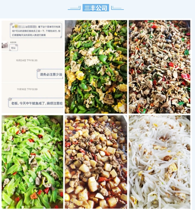 為推進(jìn)膳食平衡,構(gòu)建健康飲食體系,針對(duì)職工提出的“食堂飯菜太過油膩,需要提升口味”等問題,三豐公司積極響應(yīng),通過與食堂溝通每周菜單、定時(shí)收集員工反饋意見并及時(shí)督促食堂進(jìn)行改善等方式,不斷提升員工食堂餐飲質(zhì)量。后續(xù),三豐公司也將持續(xù)推進(jìn)該項(xiàng)工作,不斷收集員工意見,并考慮引入供應(yīng)商競爭機(jī)制,切實(shí)保障員工用餐質(zhì)量。